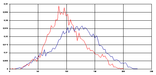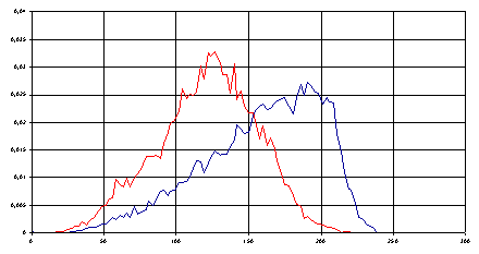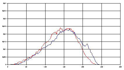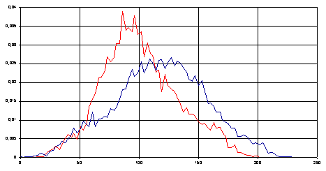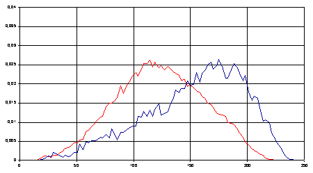 Figure 3. “FM” mode: the histograms of human body Frequency Distribution before (red diagram) and after (blue diagram) 5 minutes exposure to the mobile phone in talk mode without any neutralizer.